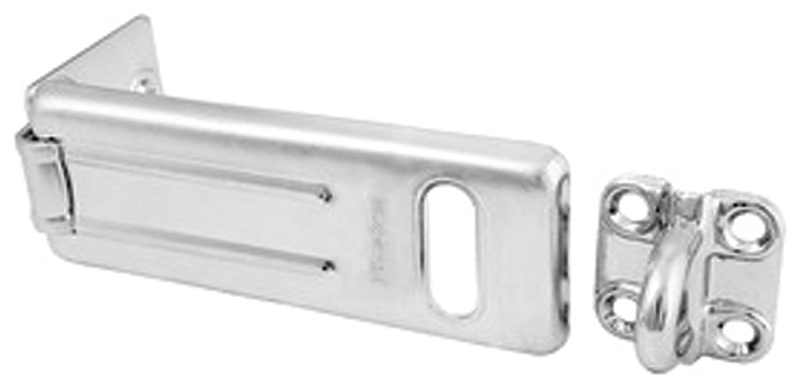 The Master Lock No. 704DPF hasp features a 4-1/2 in (11 cm) L hard wrought steel body. The zinc-plated hardened steel hasp provides added strength and weatherability. The hardened steel staple and locking eye resist cutting and sawing. The ribbed hasp plate offers extra strength and hardened steel locking eye provides strong cut resistance.