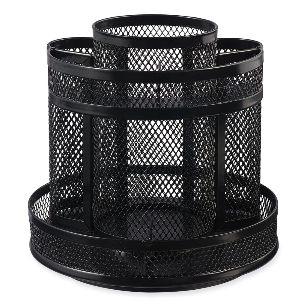 Spins for easy access to all your office supplies. Convenient multi-compartment organization to sort pens, pencils, rulers, and scissors, and low compartments for small items. Rubber padded for a good grip when rotating. Durable metal mesh construction is both strong and stable to withstand years of use. Desktop Supplies Organizer Type: Multipurpose; Number of Compartments: 8; Overall Width: 6.5″; Overall Depth: 6.5″.