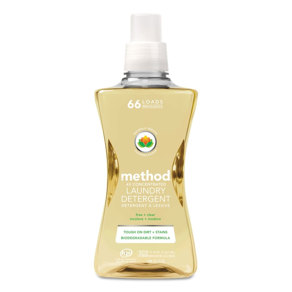 Brand Name: Method Scent: Free & Clear Product Type: Laundry Detergent Product Form: Liquid Container Size: 53.5 oz. Number in Package: 1 pk Number of Loads: 66 Packaging Type: Bottle Concentrated: No High Efficiency: No Contains Bleach: No Biodegradable: Yes