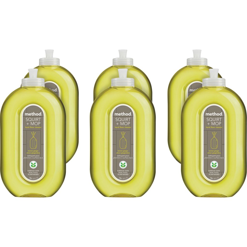 Method Squirt + Mop Lemon Floor Cleaner – Ready-To-Use Spray – 25 fl oz (0.8 quart) – Lemon Ginger Scent – 6 / Carton – Lemon| Bring beauty and shine back to your floors with this hard floor cleaner that cleans, shines and deodorizes floors. Convenient, shower-spray nozzle covers floors in fewer sweeps and helps avoid puddling. Cleaner is designed to clean all kinds of floors, including wood, stone, tile and laminate. Fresh, nature-inspired, lemon ginger scent will bring a smile to your face. Nontoxic, plant-based formula is triclosan-free and is made with no animal testing.Bring beauty and shine back to your floors with this hard floor cleaner that cleans, shines and deodorizes floors. Convenient, shower-spray nozzle covers floors in fewer sweeps and helps avoid puddling. Cleaner is designed to clean all kinds of floors, including wood, stone, tile and laminate. Fresh, nature-inspired, lemon ginger scent will bring a smile to your face. Nontoxic, plant-based formula is triclosan-free and is made with no animal testing.