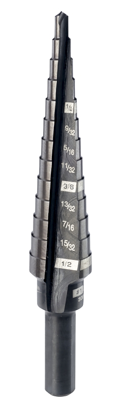 Milwaukee 48-89-9201 Step Drill Bit, 1/8 to 1/2 in Dia, 3-7/64 in OAL, 2-Flute, 1/4 in Dia Shank, Fl