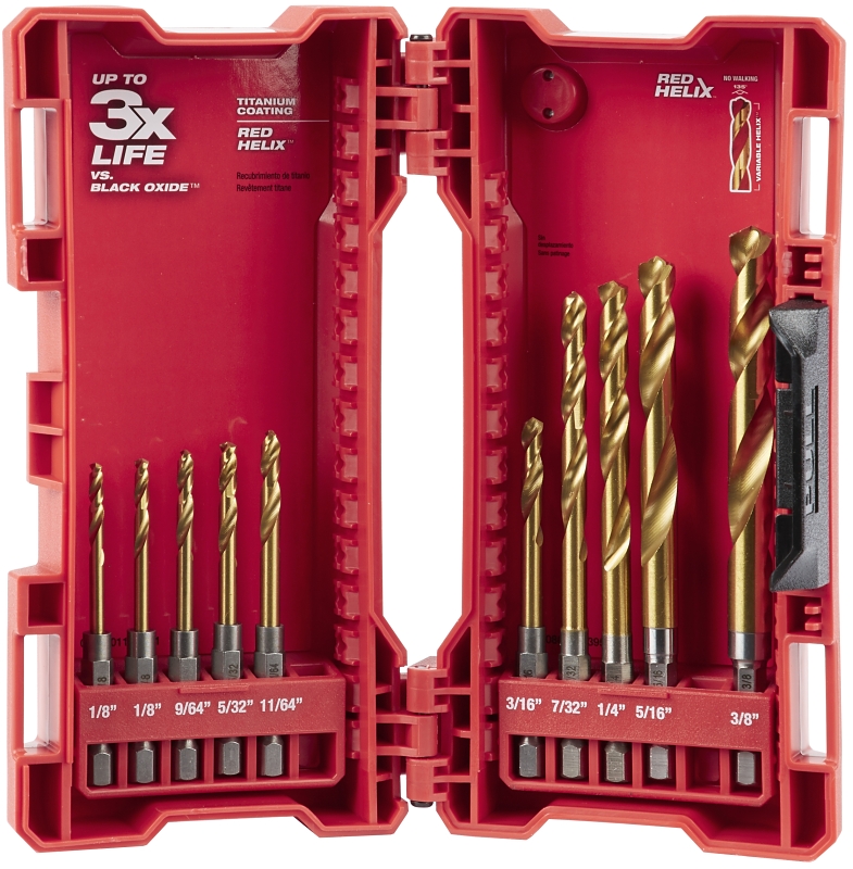 Milwaukee SHOCKWAVE Impact Duty titanium drill bits with RED HELIX are engineered for impacts and drills. Designed with a variable Helix with an aggressive 35 deg helix angle which ends at 15 deg, the Impact Duty titanium drill bits with RED HELIX provide Rapid Chip Removal to limit heat build-up to stay Sharper Longer. The 135 deg split point tip delivers a precision start and prevents walking for fast, accurate holes. Titanium coating can be used in all drilling applications to give you up to 3X life versus black oxide Drill Bits.