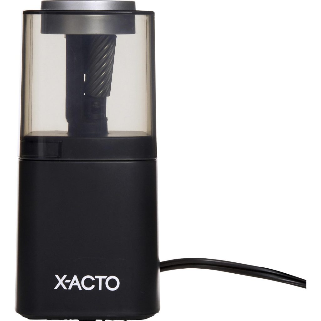 Spend less time sharpening and more time writing. Powerhouse sharpeners feature Fly-Away Cutters that minimize sharpener-related lead breakage while preventing oversharpening, to consistently deliver precision tips with minimal frustration. Innovative, visible-cutter design and anti-clog gears makes it ideal for all pencil types, including artist-quality colored pencils. Slip-resistant bottom keeps the pencil sharpener steady when in use. SafeStart electric motor locks the blades in place when the extra-large, easy-to-empty shavings bin is removed. Stay sharp with X-ACTO! Sharpener Type: Electric; Power Type: AC; Cord Length: 5 ft; Intended-Use Environment: Office.