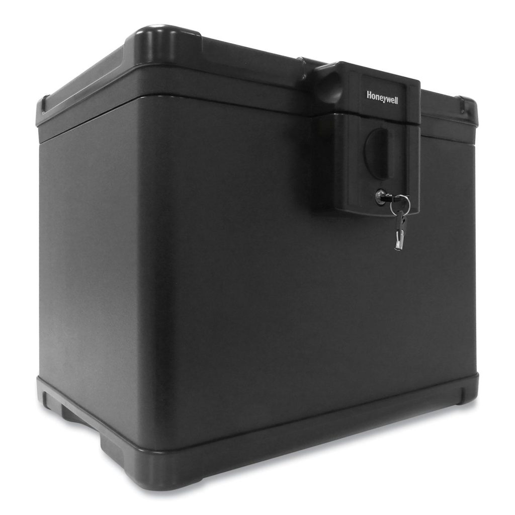 Protects paper documents and digital media. ETL 30 minute fire up to 1550F/843C. Waterproof up to 72 hours in one meter depth of water. Space fits letter and A4 hanging file folders. Key lock with two included keys. Lifetime after-fire guarantee. Outer Width: 16″; Outer Depth: 12.6″; Outer Height: 13″; Capacity (text): 0.6 cu ft.