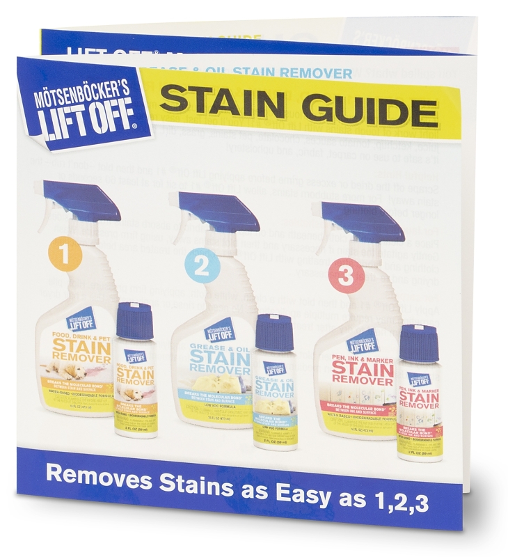 Designed to remove any stain from any surface, anywhere. Removes stains from three identified categories of stains including water and protein based stains, oil-based stains & tapes and pen, ink/marker and dye stains. Includes 2 oz bottle of each lift off formula, #1, #2, #3 and a “Name That Stain” guide to help you identify stains and remove them.