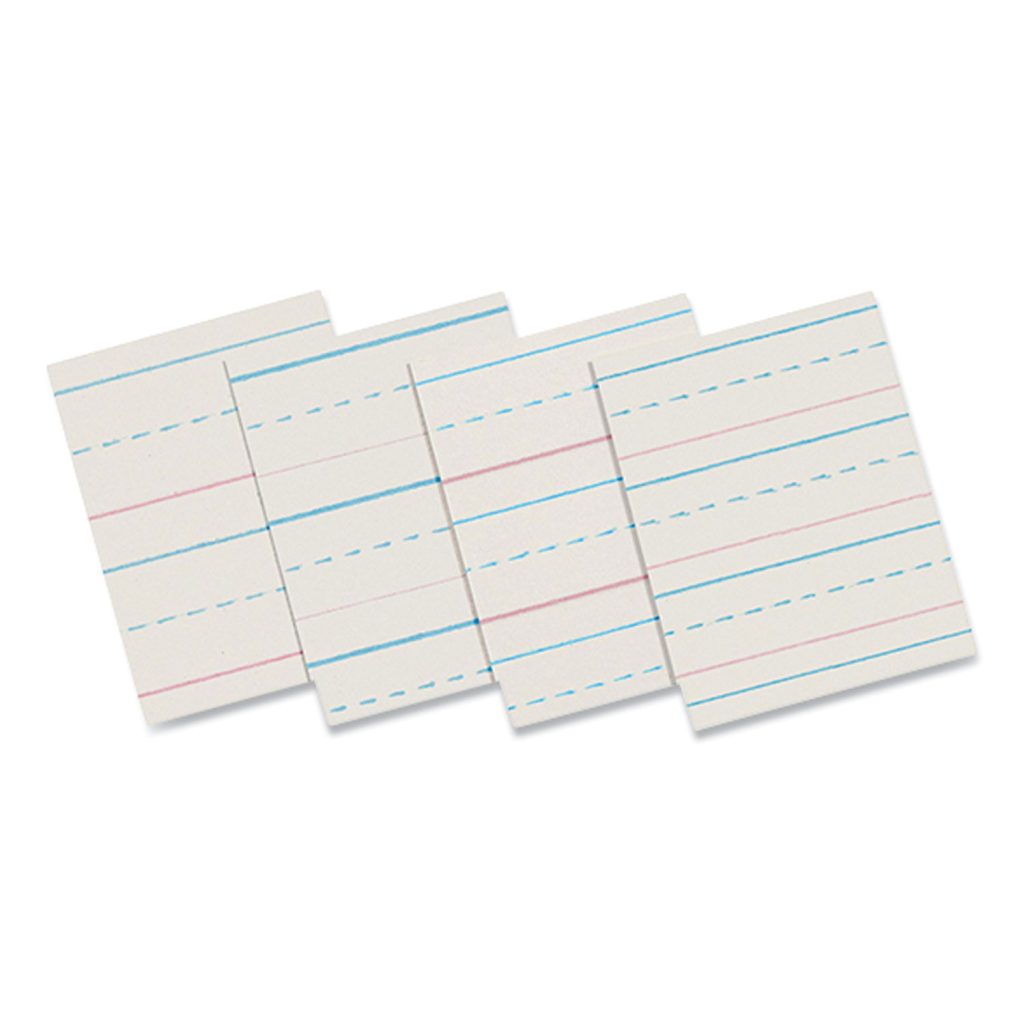 Rulings conform to Zaner-Bloser and/or D’Nealian handwriting programs. Bright tablet paper ruled on both sides with red baselines, blue dotted midlines and blue headlines. 1/2″ (Long) RulingHas dotted line and skip space of 1/4″ each. Conforms to Zaner-Bloser Grade 2. Sheet/Roll Size: 8 x 10.5; Paper Basis Weight (lb): 30 lb Bond; Paper/Media Color(s): White; Color Family: White.