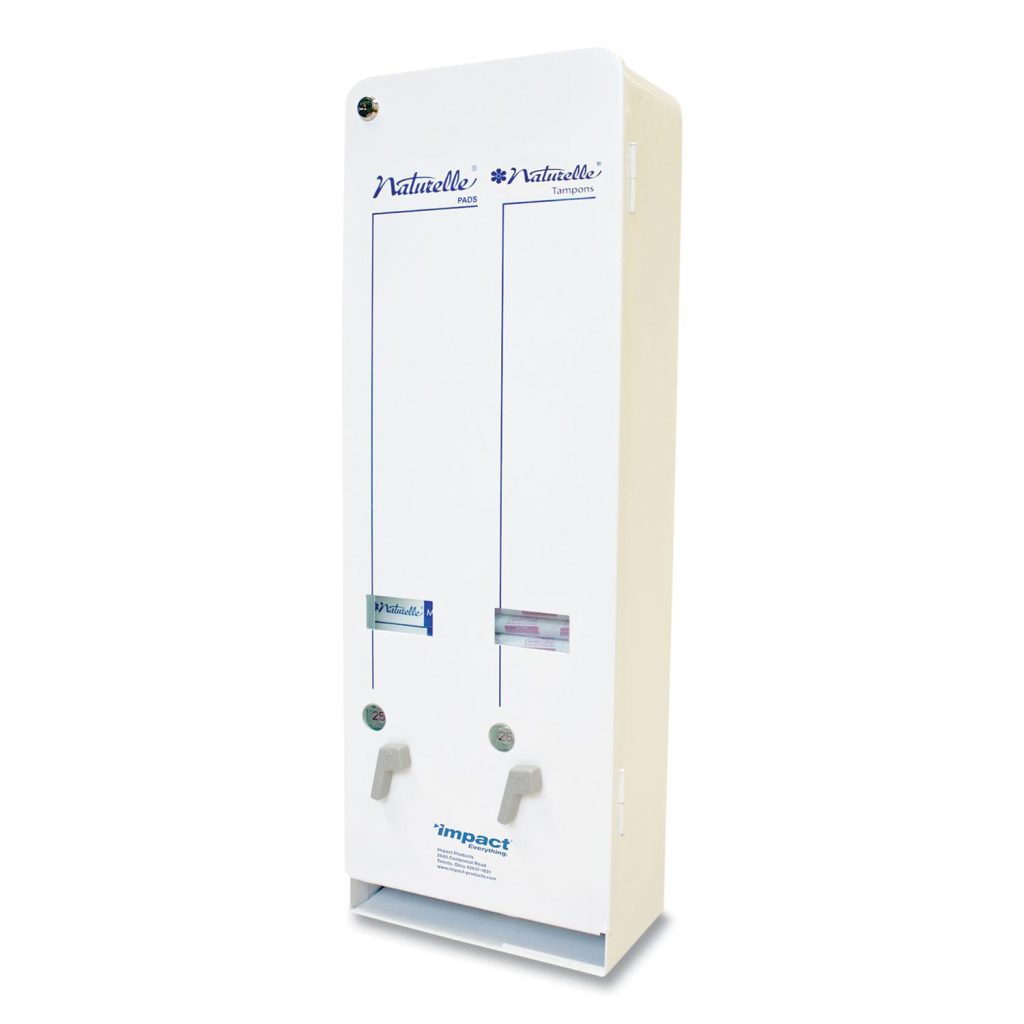 Ensure guest convenience when you install this Impact feminine product dual-dispenser machine in your building’s restrooms. Separate dispensers for #4 napkins and tampons offer users two choices to meet their personal needs. All-metal construction delivers enduring quality. Features coin payment mechanisms for easy vending. Holds: #4 Napkins; Tampons; Material(s): Metal; Color(s): White; Color Family: White.