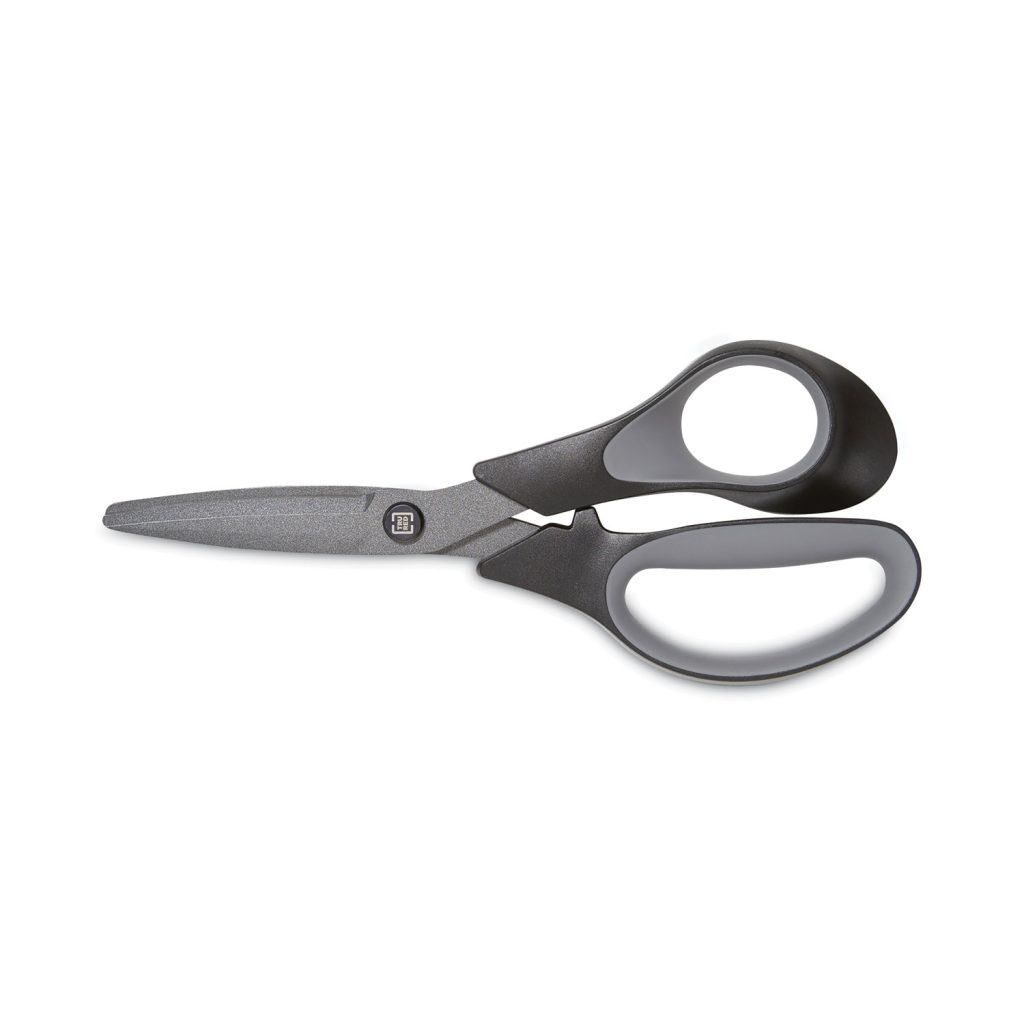 Titanium-coated steel for strength, durability and non-stick performance, these scissors are ideal even when working with double-sided tape and self-adhesive sheets. Innovative 3-D curved blades maintain sharpness and provide smooth, precise cuts each and every time. Ergonomic, soft-touch handles provide a more comfortable grip, enabling greater control. Gun-Metal Gray Blades. Cutting Tool Style: General Purpose; Tip Type: Pointed; Cut Length: 2.88″; Overall Length: 7″.