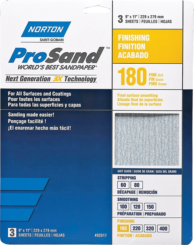 NORTON ProSand 07660768159 Sanding Sheet, 11 in L, 9 in W, Fine, 180 Grit, Aluminum Oxide Abrasive,