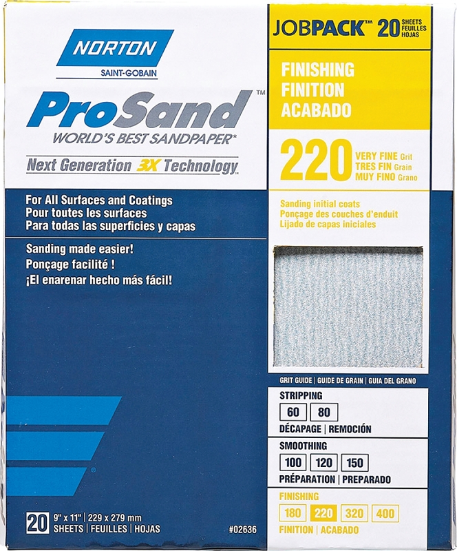 NORTON ProSand 07660768167 Sanding Sheet, 11 in L, 9 in W, Very Fine, 220 Grit, Aluminum Oxide Abras