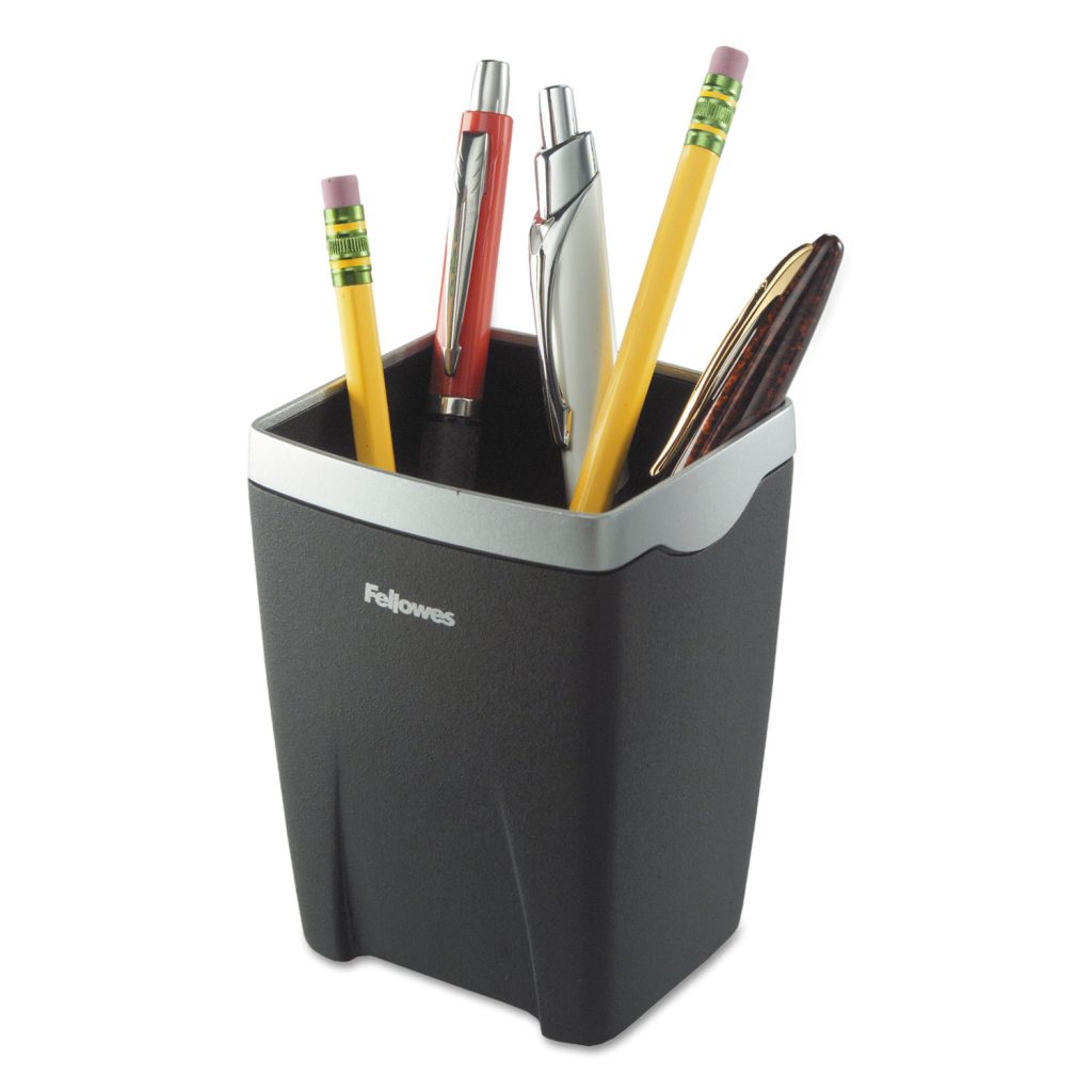 Fellowes Office Suites Pencil Cup keeps your essentials close at hand! Space-saving design holds pens, pencils, scissors or stylus. Center divider lets you organize accessories according to preference. Perfect for use in the office, home office, school, or wherever you’d like to organize your desktop. Coordinates with other Fellowes Office Suites desktop organizational products. Black and silver matte finish.