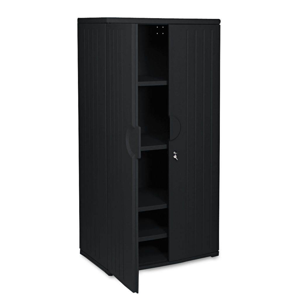 Durable, double-walled construction is resistant to dents, scratches, stains, chemicals and corrosion. Locking doors keep your storage space secure. Ergonomic handles are recessed for easy use. Made with tough, high-density blow-molded polyethylene. Easy assembly with minimal tools. 72″ High CabinetFour shelves, three adjustable. 125-lb. capacity per shelf. 27 1/2 cu. ft. Color: Black; Overall Width: 36″; Overall Depth: 22″; Overall Height: 72″.