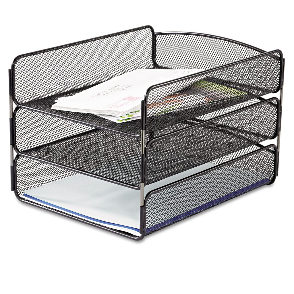 Steel mesh design with a durable powder coat finish to meet all organization needs. Keep documents organized and within easy reach while using minimal space. Three-Tray SetIncludes interlocking pins to connect trays. Number of Compartments: 3; For File Size: Letter; Load Orientation: Front; Color(s): Black.