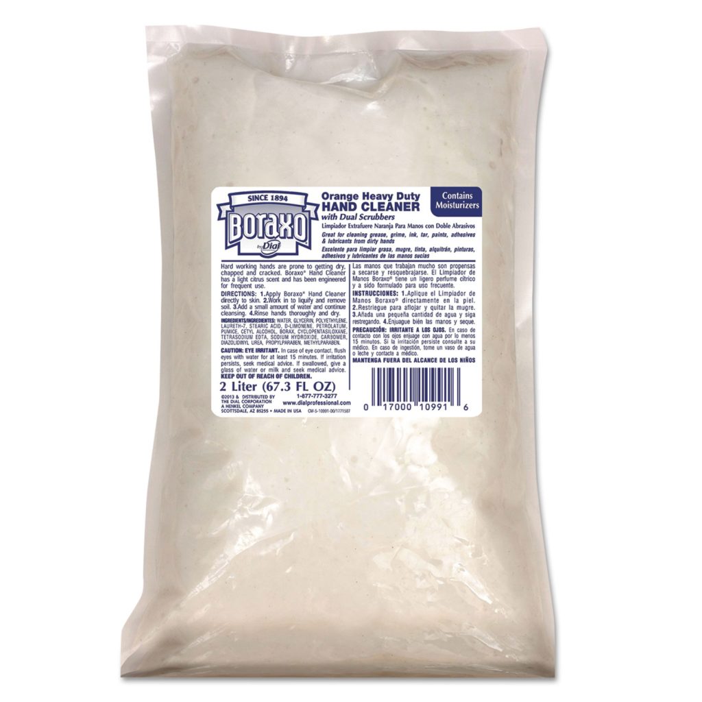 Two-in-one formula cleans and conditions the hardest-working hands. Contains dual-scrubbers and orange oil for deep cleaning. Removes tough grease, grime, ink, tar, paints and more from dirty hands. For Use with Boraxo 2L Dispenser for Heavy Duty Hand Cleaner. Soap Type: Liquid; Application: Hand; Capacity (Volume): 2 L; Scent: Orange.