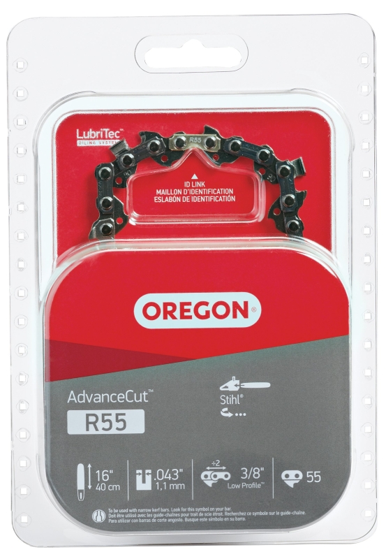 Oregon AdvanceCut R55 Chainsaw Chain, 16 in L Bar, 0.043 Gauge, 3/8 in TPI/Pitch, 55-Link