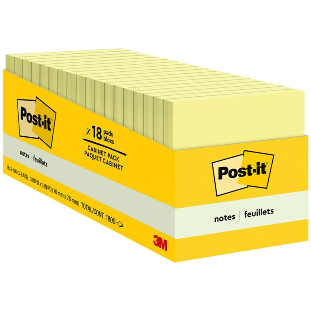 Post-it Notes Original Pads are perfect for leaving notes of encouragement. Trust Canary Yellow, the most familiar color, with your important messages. Self-stick, removable adhesive sticks securely, removes cleanly. Cabinet PackIncludes 18 pads in a convenient tray to help you keep your supplies neat and organized. Pad Type: Standard; Sheet Size (W x H): 3 x 3; Number of Sheets per Pad: 90; Ruling: Plain.