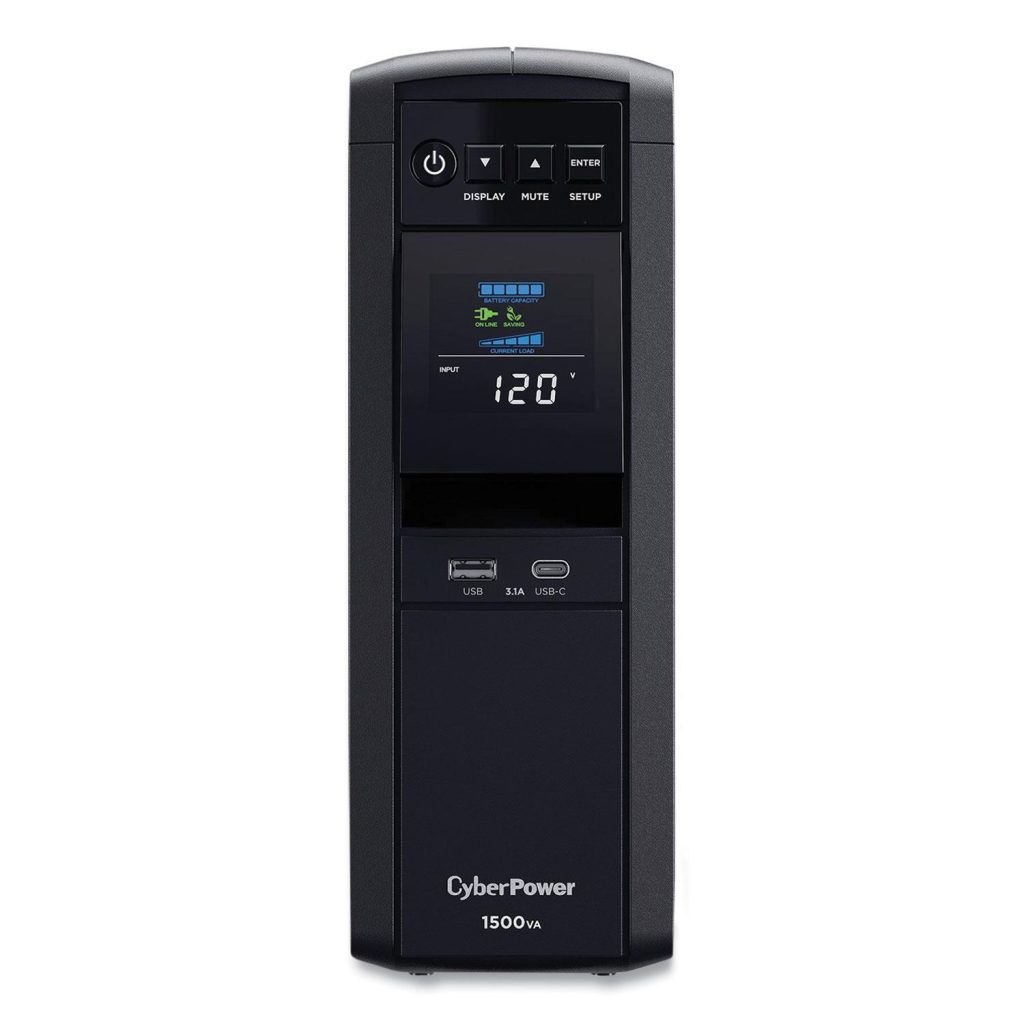 Provides battery backup (using sine wave output) and surge protection for desktop computers, workstations, networking devices, and home entertainment systems requiring active PFC power source compatibility. It features an advanced multifunction control panel with a color LCD to quickly confirm status and alerts at-a-glance. The screen tilts for easy viewing when the UPS is placed in a low position such as under a desk. System VA: 1,500 VA; Backup Time at Half Load: 10 min @ 500 W; Battery Recharge Time: 8 h; Connected Equipment Guarantee/Warranty: Lifetime $500,000.
