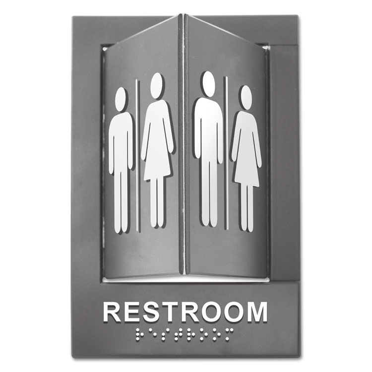 Pop-Out ADA Sign, Restroom, Tactile Symbol/Braille, Plastic, 6 x 9, Gray/White