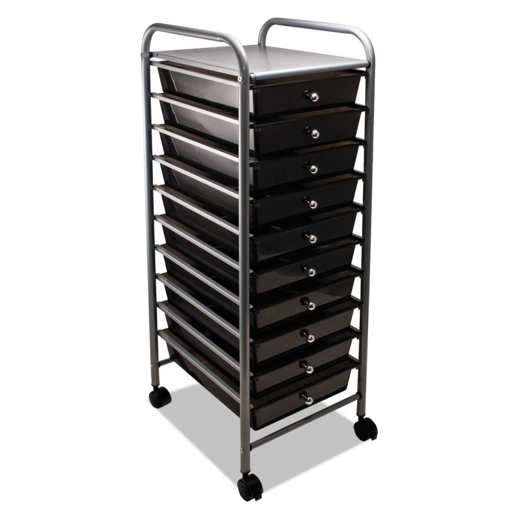 Convenient way to arrange and store your workload. Durable metal frame and chrome plated drawer pulls. Casters provide mobility. Easy assembly helps save valuable time. Ten-Drawer OrganizerTen small drawers. 37 3/4″ high. Drawers are 10-1/4″w x 14-1/4″d x 2-3/4h. Color: Smoke/Matte Gray; Color Family: Gray; Caster/Glide/Wheel: Four Swivel Casters (2 Locking); Material(s): Metal Frame; Plastic Drawers.