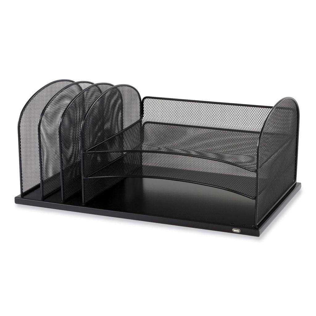 Organizers feature a USB port to easily charge electronics. Durable, designed with steel mesh construction. The Powered Three Horizontal and Three Upright Sections Organizer is a versatile filing center that is designed with three trays for letter-size documents and three large-capacity upright sections for file folders and binders. Includes USB cord and power cord to plug into wall. It features a steel mesh construction for durable desktop organization. Number of Compartments: 6; For File Size: Letter; Load Orientation: Front; Color(s): Black.