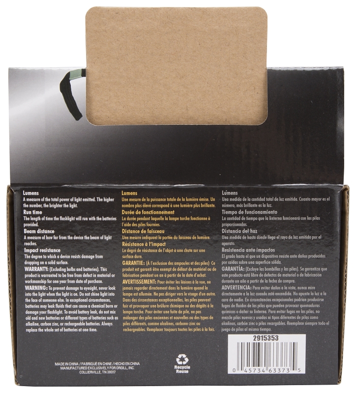 LED Plastic flashlight, 12 hrs runtime. 50 lumens. Powered by 3 AAA batteries, not included. Display box contains three pieces each: blue, green, red and orange.
