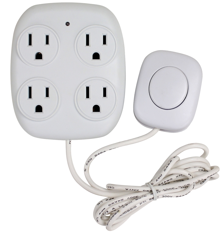This PowerZone 4-Outlet Power Tap comes with a remote switch that enables you to turn on/off everything from one spot. Ideal for behind a sofa with 2 end-table lamps. The remote switch is attached to a 6ft cord and has soft pads on the bottom so it can sit on an end table or on the floor and won’t slide or scratch sensitive surfaces. Ideal for behind a sofa with 2 end-table lamps.