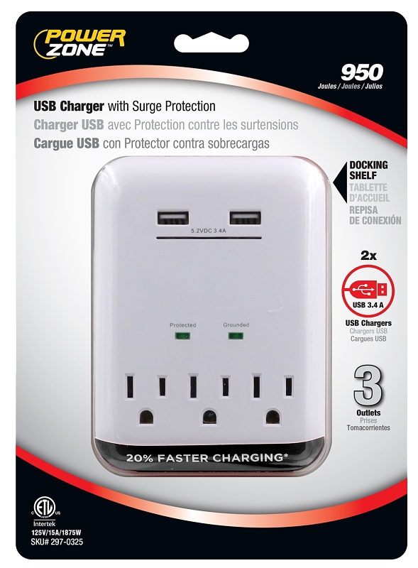 PowerZone ORUSB343S USB Charger, 125 V, 15 A, 3-Outlet, 950 Joules Energy, White