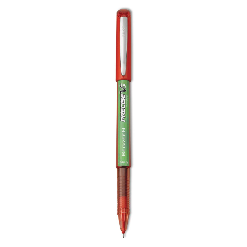 Recycled roller ball pen features a unique liquid ink formula that flows smoothly and evenly across the page. Patented Precision Point Technology delivers an extra fine writing experience. Precise V5 BeGreen is made from recycled material and is refillable for continued use. BeGreen without sacrifice.