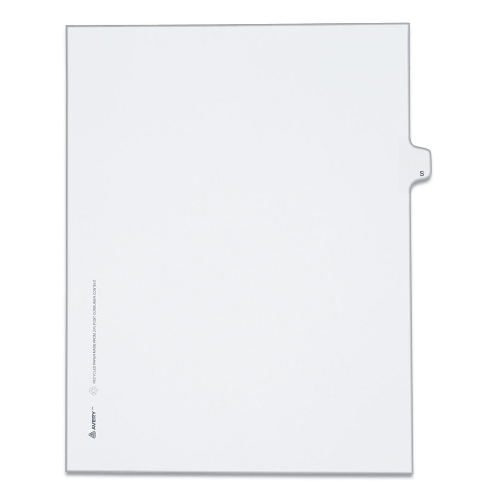 Rip Proof reinforced, dual-sided, laminated tabs make it easy to organize your information. The binding edge is unpunched, so these dividers can fit practically any binding system. Ideal for briefs, legal exhibits, mortgage documentation files and more! Avery Style is Helvetica bold type style and Allstate Style is Helvetica regular type style. Individual Letter, 11 x 8.5, Side Tab. Index Divider Style: Legal Alpha; Index Divider Size: 11 x 8.5; Punched/Unpunched: Unpunched; For Use With: Comb Binding Systems.