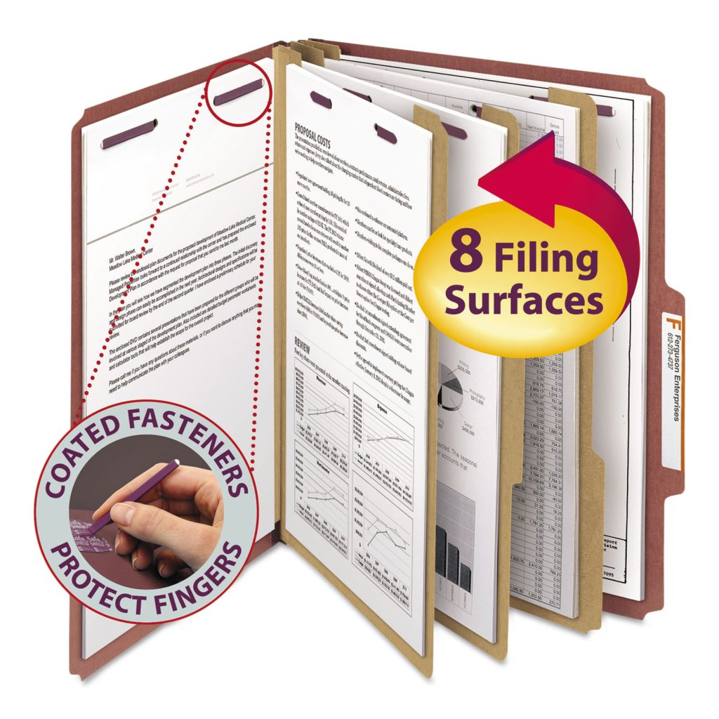 The ultimate classification folder when safety and security are most important. SafeSHIELD bonded fasteners add protection for papers and fingers, while also reducing fastener crinkling. Heavy-duty classification folders make ideal project files. Sturdy tear resistant gusset expands to hold either 2″ or 3″ of material. Made of pressboard for extra durability. 2/5 Cut Right of Center Position Self Tabs on Cover. Folder Size: Letter; Total Number of Dividers: 3; Total Number of Fasteners: 8; Max Folder Expansion: 3″.