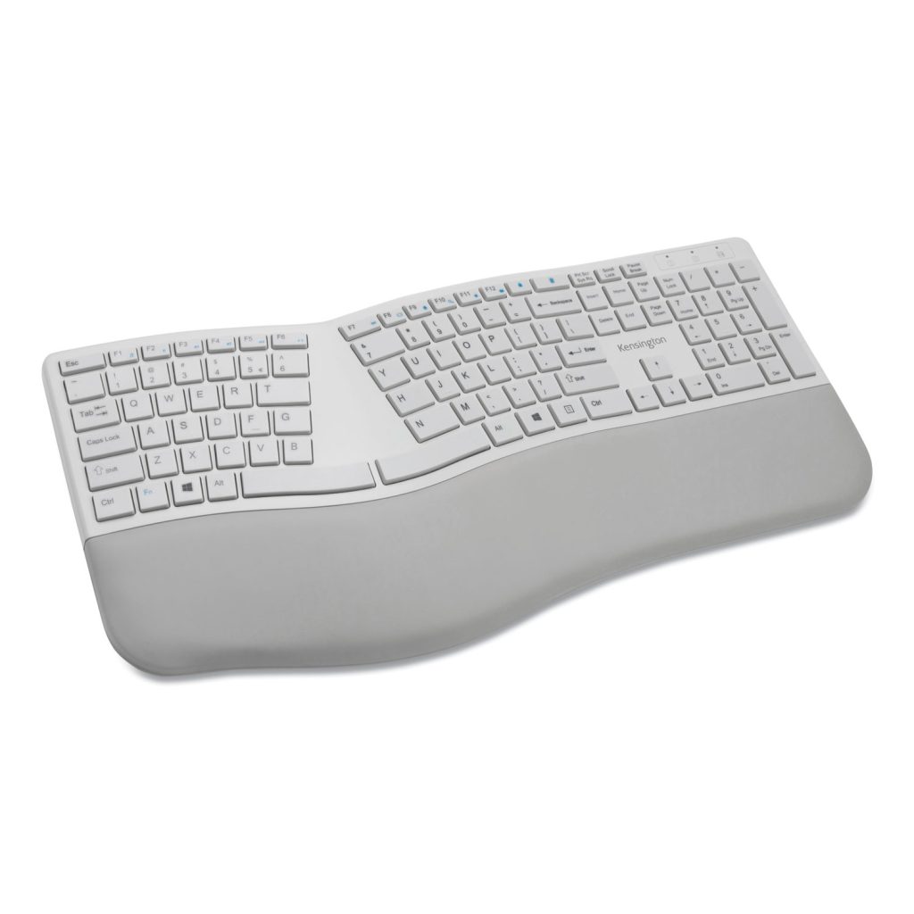 With its split and sloped keyboard with adjustable reverse tilt and built-in wrist rest, the ergonomist-approved Pro Fit Ergo Wireless Keyboard positions your hands for improved comfort. Features include dual wireless (2.4 GHz and Bluetooth 4.0 LE) with 128-bit AES encryption security; quiet typing; spill-proof keys; F-keys for shortcuts; caps lock, numbers lock, and scroll lock; a three-mode power-saving switch; and a replaceable receiver. In the event the receiver is lost or damaged, simply purchase a new one, pair it with your mouse, and you’re all set. Wired/Wireless: Wireless; Maximum Wireless Range: 33 ft; Connector/Port/Interface: Bluetooth; USB; Keyboard Design: Ergonomic.