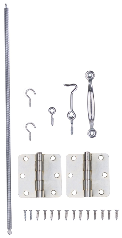 For hanging lightweight wood screen doors in full surface or mortise applications. Includes 2 hinges, door pull, hook & screw eye, coil spring and screws.