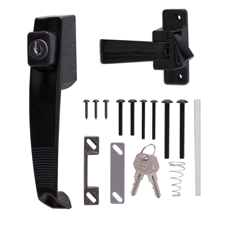 This push button door latches comes finished in black. It is designed for use on outswinging wood or metal screen or storm doors.