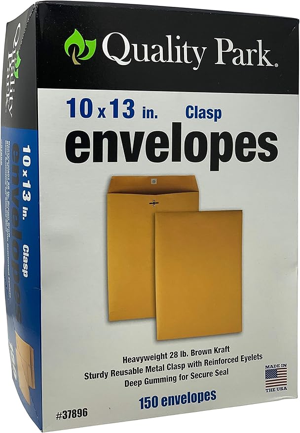Product Details Model: QUA37896 Clasp Envelope Metal clasp closure Size: #97 Weight: 28 lb Overall dimensions: 10.063” x 15” Brown Kraft 150 ct More Information: Durable double-prong metal clasps and reinforced eyelets for continuous daily use Heavily gummed moisture-activated flap seals tight for secure mailings 28 lb. Brown kraft stock gives privacy and protection for storage, interoffice and postal mail Large 10” x 13” size helps you organize, sort and store over-sized documents flat. Specifications BrandQuality Park Closure TypeGummed Flap ColorBrown Length13 in. MaterialKraft ModelQUA37896 Number of Envelopes150 Paper Weight28 lb. Size Class#97 Width10 in.