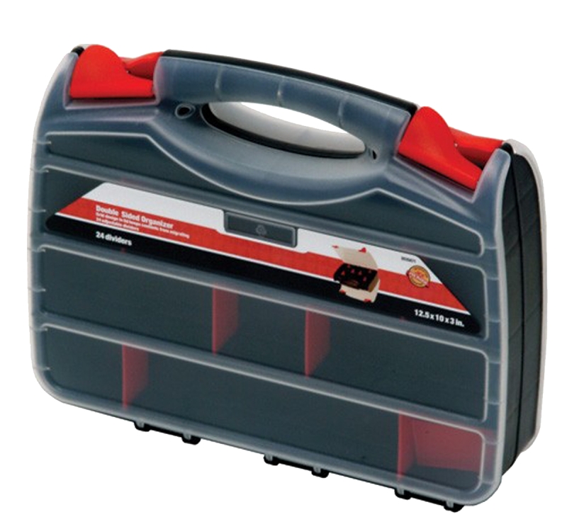 The ORG80322 double-sided organizer offers over 30 storage compartments and a clear lid gives easy viewing of the contents inside. The organizer opens on both sides and clips tightly shut for added security.