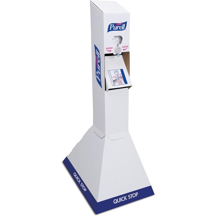 All-in-one floor stand kit allows easy access to hand sanitizer. Great solution when immediate access to hand sanitizer is important and counter space is scarce. The easy to assemble, corrugated stand is an ideal choice for special events and situations where you need to provide temporary hand hygiene hand for customers, guests or employees. The kit comes complete with two 1L PURELL Advanced Hand Sanitizer refills. Hand sanitizer uses an alcohol-based formula to kill 99.9% of most common germs that may cause illness, providing a thorough clean. Corrugated stand can be easily moved and placed where needed most. Mounting: Floor Stand; Holds: 1,000 mL; Material(s): Corrugated; Color(s): White/Blue.