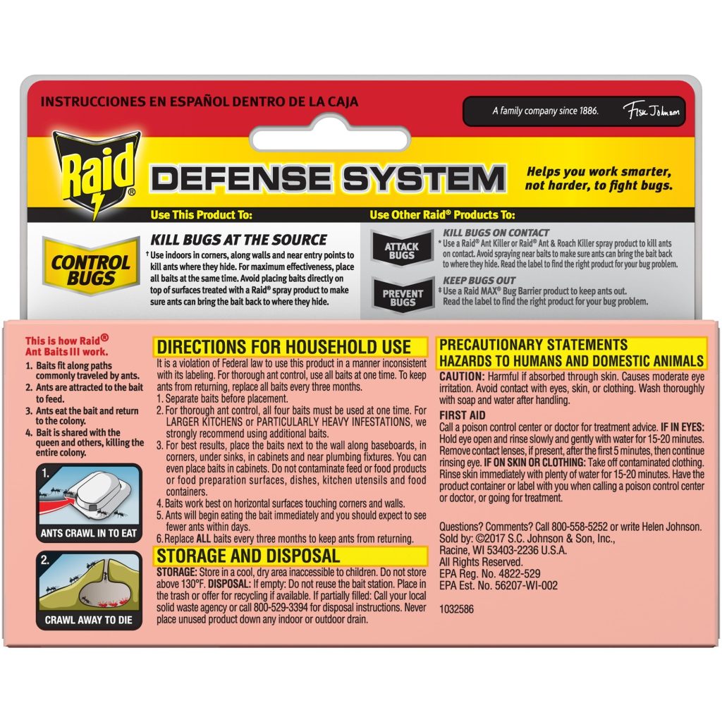 RAID MAX double control ant baits have two types of bait to attract and kill ants. After ants feed on the bait, they return to the colony and transfer the bait to the queen and the others, thereby killing the entire colony. Population reduction can be expected within days, with the baits working for up to 3 months. RAID MAX double control ant baits are child-resistant.