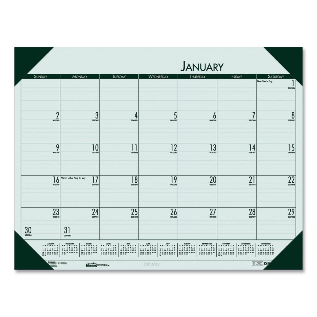 Pastel color recalls a color from nature. Strong, reinforced color-matched leatherette corners complement the pad’s paper while keeping the pages in place and protected. Full-year reference calendar aids in planning throughout the year. Features numbered weeks, Julian dates and days remaining. Lightly ruled daily blocks help keep notations neat. Made entirely of recycled materials. Size: 22 x 17; Page Color/Theme: Woodland Green; Edition Year: 2021; Calendar Term: 12-Month (Jan-Dec).