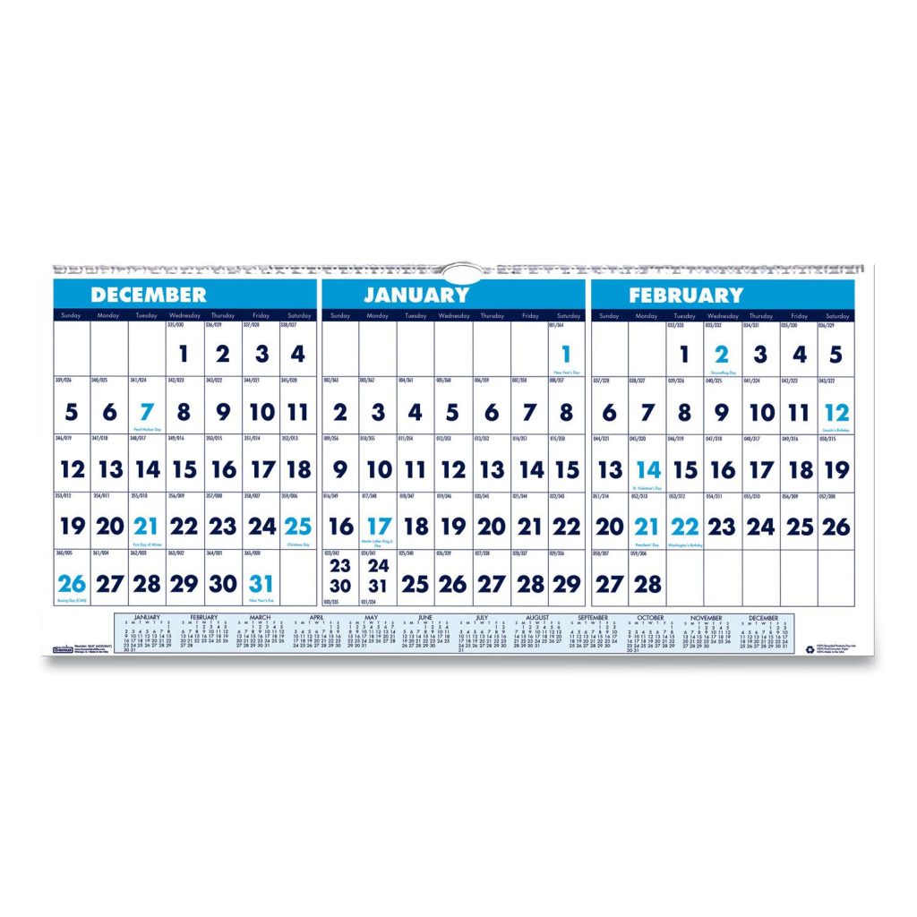See three months at a time. Wall calendar details the prior, present and following month on each page. Large date numerals with holidays highlighted. Strong wire-binding firmly keeps the pages together and in place. Features a full, 12-month reference calendar for long-term planning. Sturdy wire hanger makes it easy to hang the calendar on the wall. Made entirely of recycled materials. Horizontal FormatPerfect for open plan systems. Size: 23.5 x 12; Page Color/Theme: White; Edition Year: 2020-2022; Calendar Term: 14-Month (Dec-Jan).