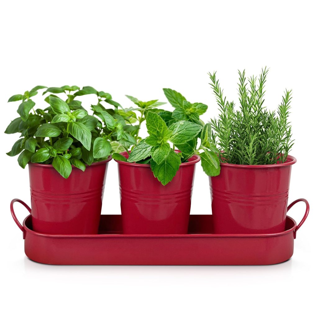 Red Metal Indoor Herb Garden Planter Set with Tray, Set of 3