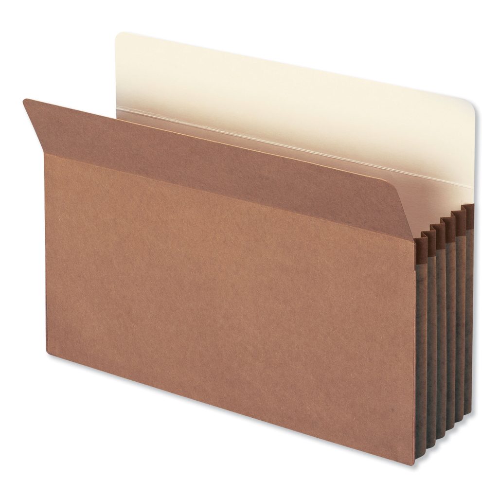 Manage bulky records with these sturdy file pockets that are available in a variety of expansions. The 6.5″ high gussets are reinforced at top with rollover tear resistant material strip to make them virtually tear-proof. Back of pocket lined with 11 pt manila stock for added strength and easy identification of subject heading. Bottom and sides fully enclosed. Made of sturdy redrope stock.