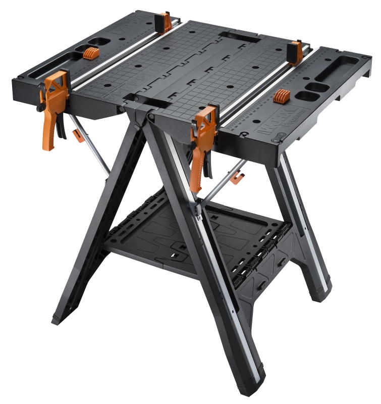Instant set up, portable all-in-one work table, clamping system and sawhorse. Integrated clamping system holds materials straight, angled, combined, up, down and around. It holds materials so your hands are free to work. Compact design for effortless transport and storage. Built with organization and layout tools that make you more productive.