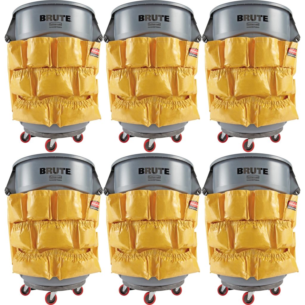 Rubbermaid Commercial Brute Utility Container Caddy Bag – 12 Pocket(s) – 11″ Height x 20″ Width x 20.5″ Depth – Yellow – Nylon – 6 / Carton| Caddy Bag provides storage for everything from wet floor signs to spray bottles to extra can liners and all the other cleaning supplies needed for on-the-go cleaning. It securely attaches around Rubbermaid Brute round containers. 12 pockets of various sizes accommodate most cleaning supplies. Durable, nylon-reinforced vinyl is strong and easy to keep clean.Caddy Bag provides storage for everything from wet floor signs to spray bottles to extra can liners and all the other cleaning supplies needed for on-the-go cleaning. It securely attaches around Rubbermaid Brute round containers. 12 pockets of various sizes accommodate most cleaning supplies. Durable, nylon-reinforced vinyl is strong and easy to keep clean.