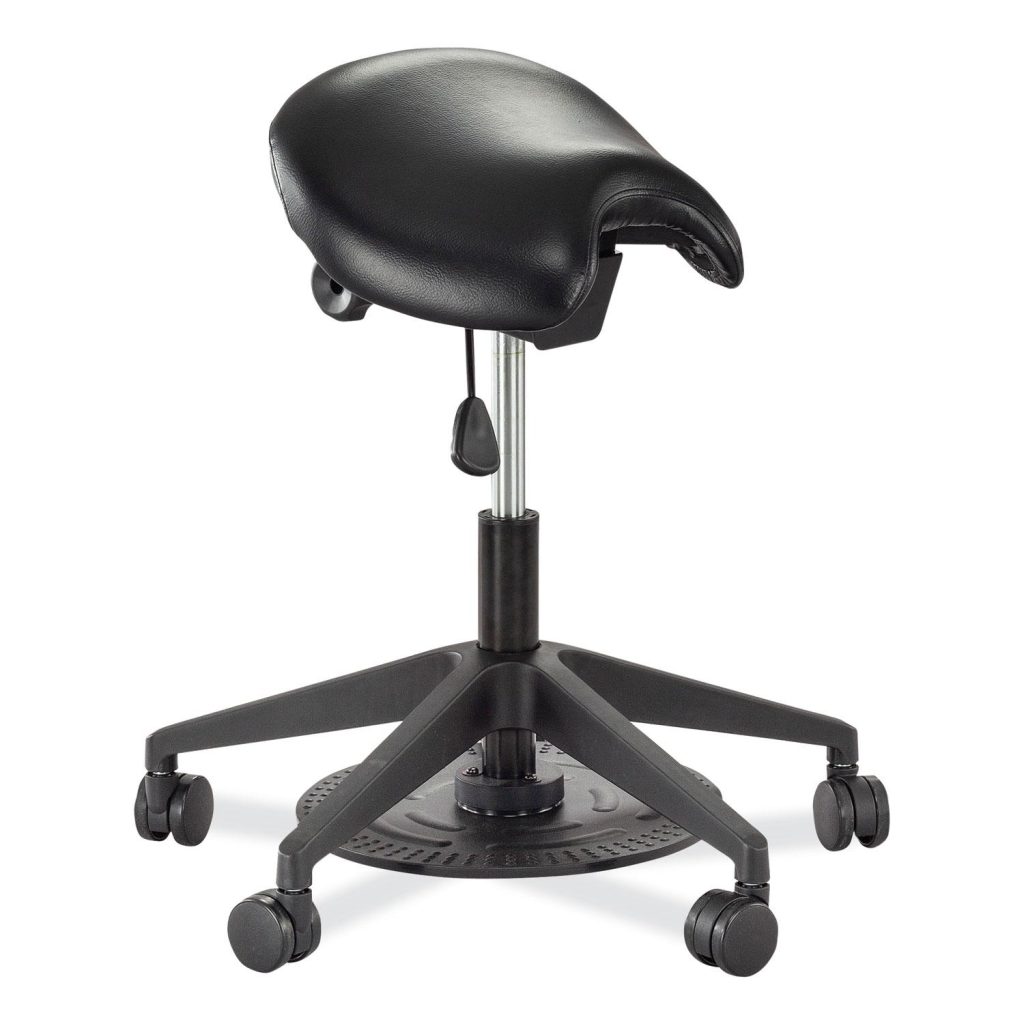 The Saddle Seat Lab Stool features a saddle seat that helps to keep the hips engaged, encourages better posture and may allow better breathing from the diaphragm. The lab stool also features two ways to adjust its height. Simply use your heel to push down on the foot pedal plate, or use the pneumatic height-adjustment lever under the seat. Both adjustments have a range of 21 to 27″. Stool is mobile on five casters and is stable on a five-star, nylon base. Seat is made from easy-to-clean vinyl. Recommended Application Area(s): Assembly/Repair & Technical Task; General Office & Task; Healthcare; Seat Color: Black; Color Family: Black; Arms Included: No.