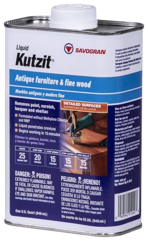 For refinishing fine furniture and antiques, Kutzit is the professional refinishers choice. It is excellent for horizontal surfaces and its liquid formula cuts fast and penetrates carved detail. Kutzit is gentle on the patina of fine wood and veneers and will not raise wood grain. Surfaces can be cleaned with a scraper and washed with a cloth and paint thinner. Kutzit is flammable and is recommended for use outdoors.