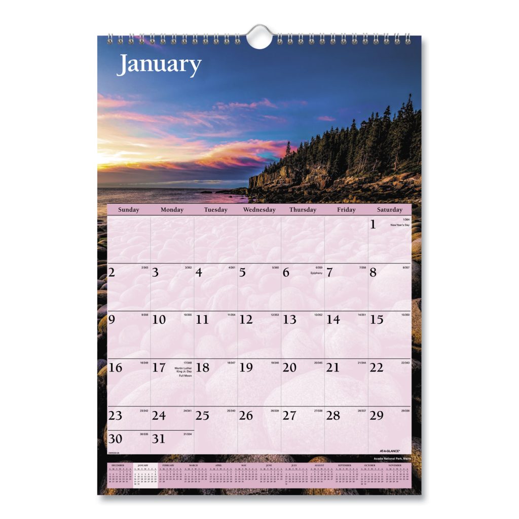 Escape with a stunning scenic image each month. Features full-color photos. One month per page with unruled blocks. Full-year calendar reference; federal holidays highlighted. Bonus page: current year reference calendar. Chipboard backing; white wirebound with hanging loop. Printed on high-quality paper with superior ink bleed resistance. Size: 12 x 17; Page Color/Theme: Scenic; Edition Year: 2021; Calendar Term: 12-Month (Jan-Dec).