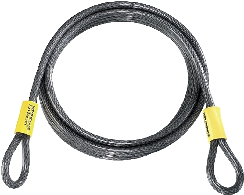 Braided steel vinyl-coated cable with extra long oversized swages. Double loop design allows cinching for more usable length and more flexible lock-up options with Kryptonite padlock or any padlock. 3/8 in Dia cable.