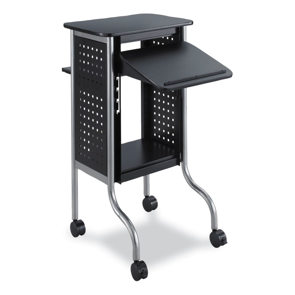 Supports laptops, computers and projectors. Handy bottom shelf for storage. Height-adjustable presentation shelf. Features four swivel casters (two locking). Color: Black; Color Family: Black; Caster/Glide/Wheel: (2) Twin-Wheel Locking Swivel Casters; (2) Twin-Wheel Non-Locking Swivel Casters; Overall Width: 21.5″.