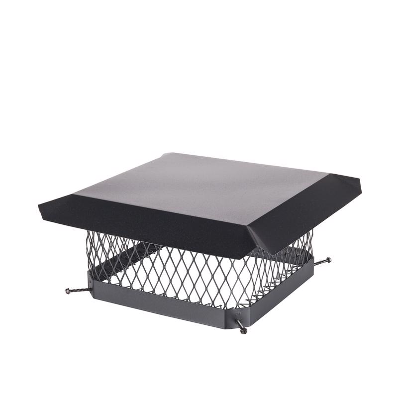 The black galvanized steel SHELTER chimney cover is the durable and economic choice for chimneys in most regions. The outside mounting design provides maximum free air space and better draft while the attractive powder-coat finish helps it stand up to the elements. Made with a 24 ga galvanized steel hood with scalloped corners and roll-formed edges, 18 ga expanded galvanized steel mesh, 14 ga galvanized steel base and slotted hex-head bolts. Seven year limited warranty.