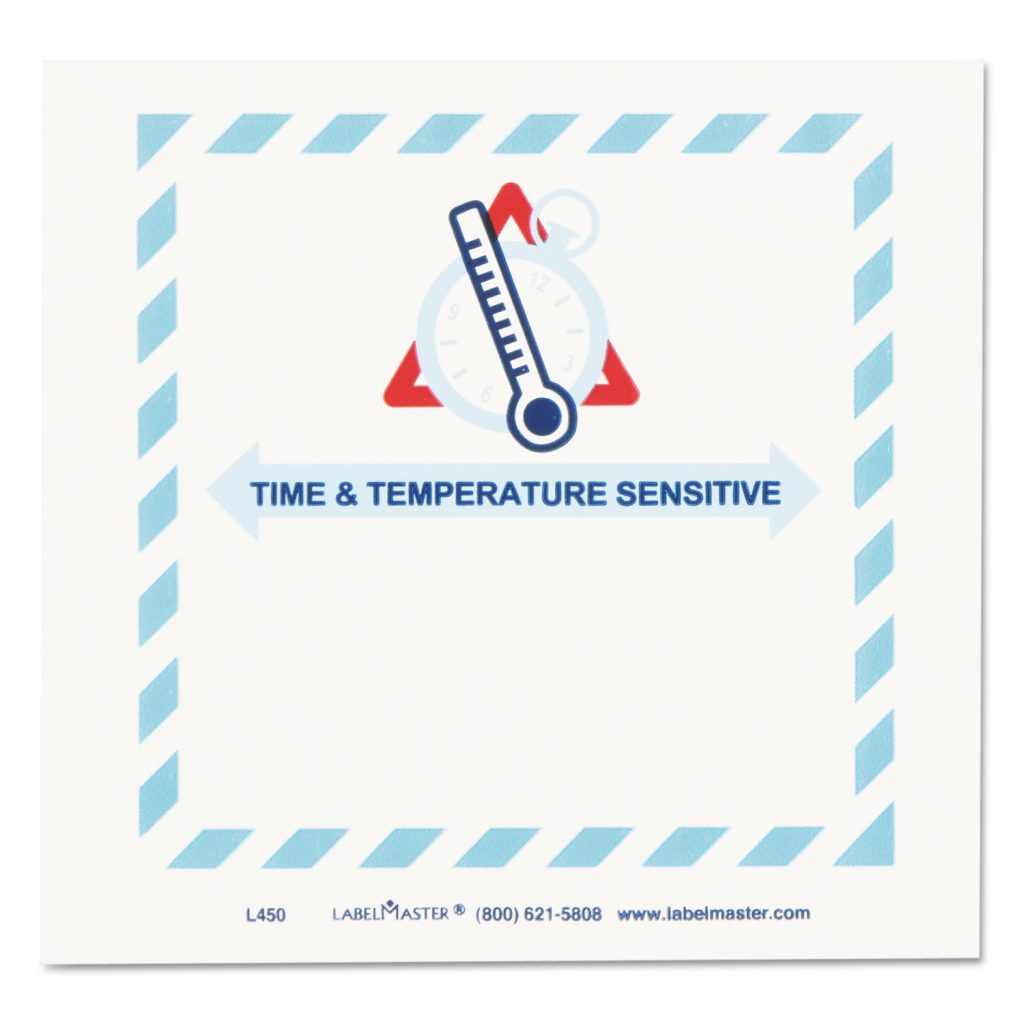 Shipping and Handling Self-Adhesive Labels, TIME and TEMPERATURE SENSITIVE, 5.5 x 5, Blue/Gray/Red/W